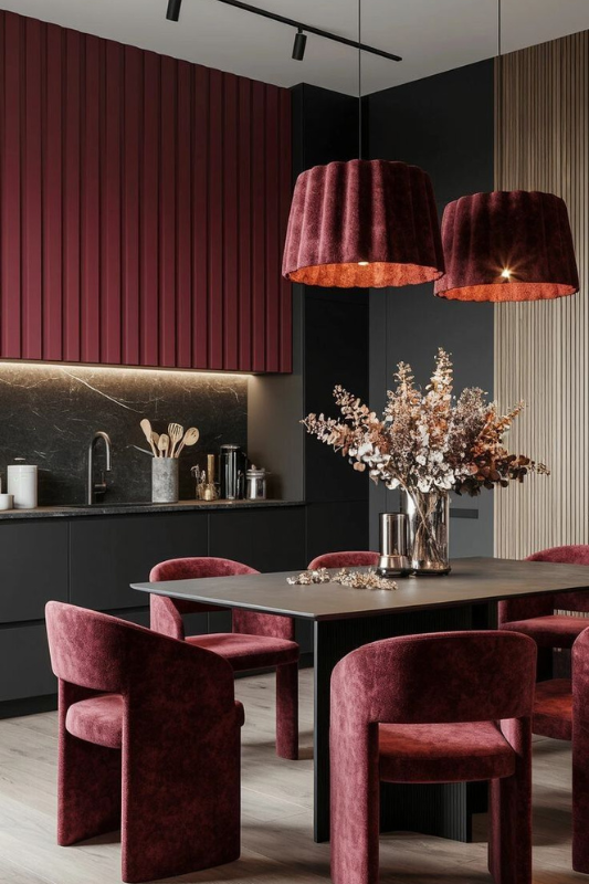 This modern burgundy and black kitchen feels bold and sophisticated. The deep red panels and velvet chairs bring a plush, refined touch, while the matte black surfaces add drama and balance. The layered textures, from the ribbed wall detail to the soft lighting, make the space visually rich and inviting.