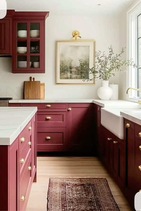 This airy burgundy and white kitchen captures effortless elegance. The soft burgundy cabinets paired with brass hardware and bright walls give the room a fresh, graceful look. Natural light enhances the gentle warmth of the color, while marble counters and framed artwork complete the polished feel.