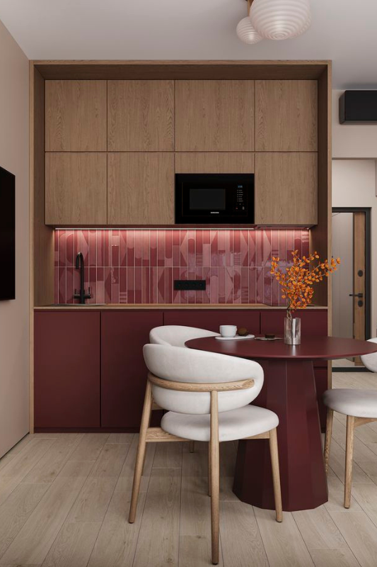 This compact burgundy kitchen proves that small spaces can be just as stylish. The matte burgundy base cabinets and wood upper storage create a balanced, modern feel, while the slim backsplash adds depth without clutter. The matching round dining table and soft neutral chairs keep the overall design calm and inviting.
