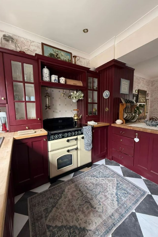 This vintage-inspired burgundy kitchen feels timeless with its paneled cabinets, warm wooden countertops, and checkerboard floors. The cream colored range and antique style accessories give the room a nostalgic feel, while the deep burgundy cabinetry anchors the space with elegance.