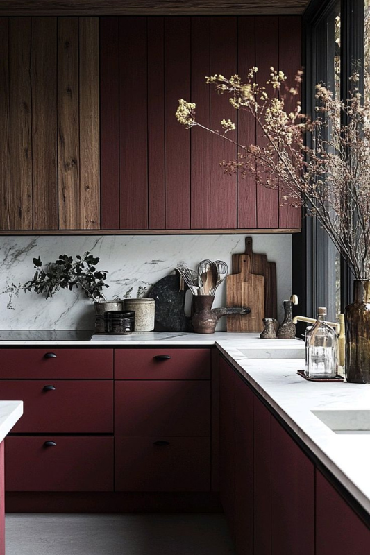 Touches of greenery and natural light balance the richness of the color, proving that burgundy kitchen décor can feel both elegant and uplifting. This style suits those who want a kitchen that blends traditional charm with modern sophistication.