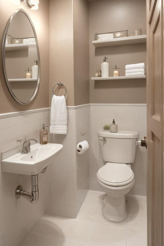 If you’re short on space but big on style, this half bath idea for small spaces is the upgrade you need. A sleek wall-mounted sink keeps the floor clear, making the room feel more open and functional. Neutral tones and white subway tile create a light and airy bathroom design, while floating shelves offer practical storage without bulk. This clean and simple layout is ideal for anyone looking to create a modern powder room that feels fresh, uncluttered, and inviting, perfect for everyday use or weekend guests.