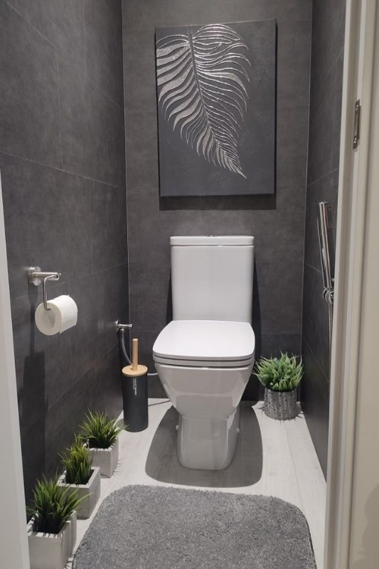 If you want a powder room that feels bold and moody, start here. This design surrounds the toilet in dark charcoal tile with silver accents and a large metallic art piece for drama. Soft gray flooring and lush green plants keep it grounded. This setup is a great match for monochromatic half bath color scheme ideas or anyone looking to create a luxury half bath with a contemporary edge.