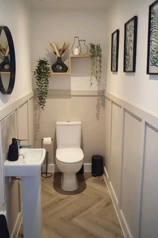 This half bath uses clean wainscoting and a soft color palette to create a calm and tailored look. Black framed art, leafy greenery, and a small pedestal sink give the space a polished but natural feel. The light wood flooring and thoughtful decor choices make this one of the best small half bath ideas for narrow layouts. If you need a stylish half bath for a modern farmhouse or transitional home, this one fits beautifully.