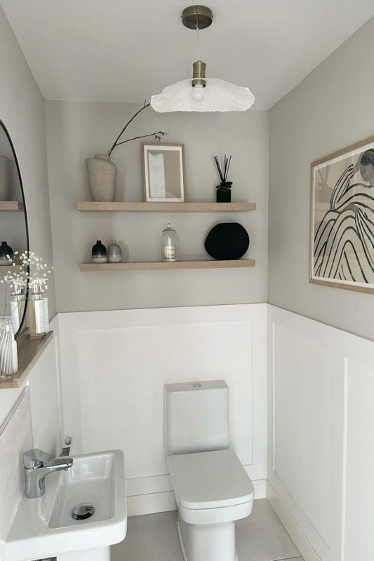 This soft neutral powder room creates a calm and curated atmosphere using light wood shelving, sculptural decor, and clean wall paneling. The muted color palette keeps the space airy, while a statement light fixture adds style without taking up visual space. This look is ideal for anyone drawn to light neutral half bath designs that balance warmth and minimalism.