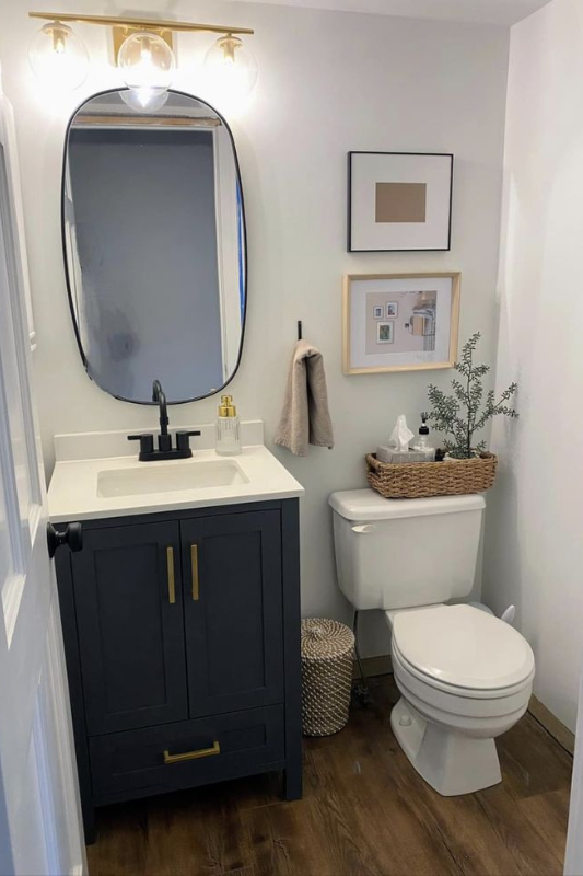 This half bath pairs a classic white countertop with a deep navy vanity and matte black fixtures for a clean, modern contrast. The wooden floors add warmth, while the wall art and basket details soften the space. This design nails the balance of form and function, making it one of the best small half bath vanity ideas to save space while adding style.