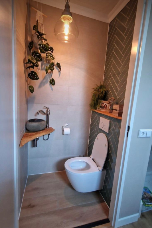 This half bath mixes rustic and modern details in all the right ways. A live edge wood vanity and round stone sink add texture and weight, while vertical green tile adds movement and color. It is one of the most creative half bath designs if you want to use organic materials without overwhelming a small space.