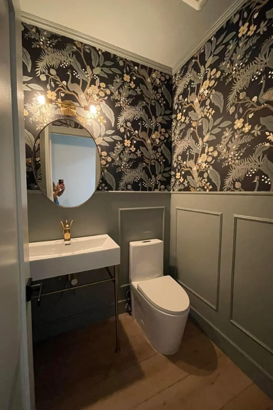 Floral wallpaper wraps this powder room in mood and movement, balanced beautifully by olive green wainscoting. A gold mirror and brass lighting add elegance, while the clean pedestal sink keeps the focus on the details. This is a top choice if you are searching for bold wallpaper ideas for powder rooms with a refined twist.