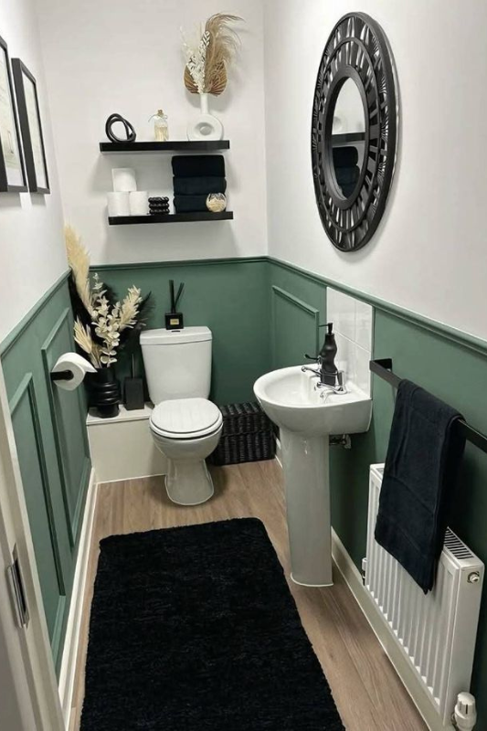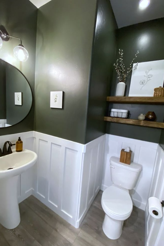 Dark green walls paired with crisp white panel molding create a grounded and confident look in this half bath. The circular mirror, warm wood shelves, and earthy decor complete the space with character and texture. If you are drawn to guest bathroom ideas that blend nature-inspired tones with a timeless finish, this one is for you.
