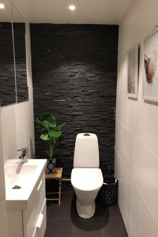 17. Imagine Stepping into a Powder Room with a Black Stone Accent Wall