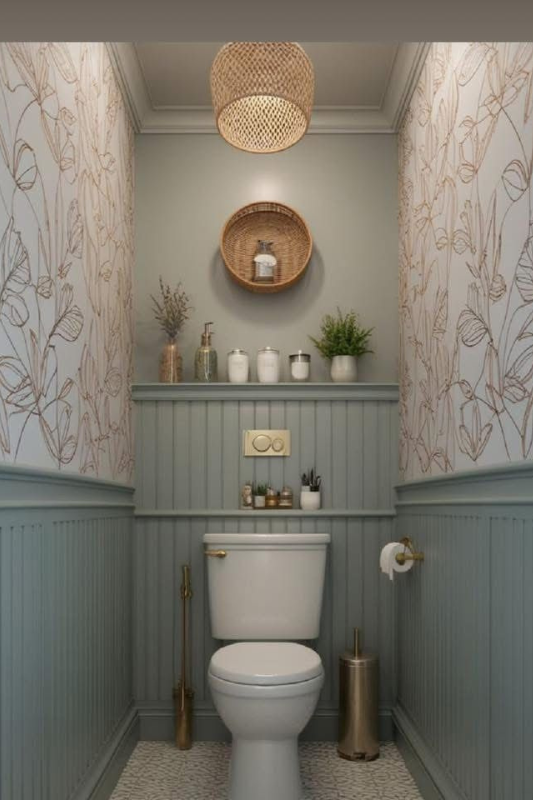 This is one of those guest bathroom ideas that makes you want to linger. The combination of sage green wainscoting, soft floral wallpaper, and subtle gold fixtures strikes a perfect balance between cozy and elevated. Open shelving above the toilet keeps essentials in reach while acting as a display for candles, greenery, and ceramic jars. This space proves that small half bath decor can still feel custom and curated. If you’re drawn to creative half bath designs that feel thoughtful and warm, this one delivers.