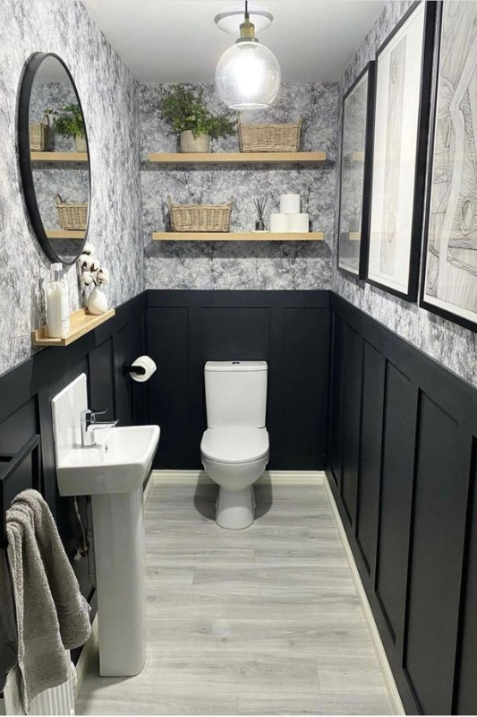 This small powder room uses black paneling and a marble effect wallpaper to create dimension and contrast. Floating shelves, woven storage baskets, and soft lighting add just enough warmth. Ideal for anyone searching for monochromatic bathroom ideas with personality, this design layers tone and texture to perfection.