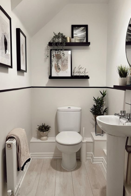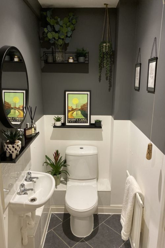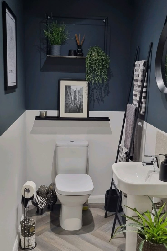 Charcoal blue walls and white paint split the visual weight in this narrow layout, making the room feel taller and more spacious. Simple wall art, trailing plants, and black shelves add contrast without clutter. For small half bath ideas that feel calm, modern, and curated, this one checks all the boxes.