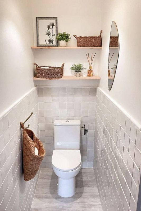 This tiny bathroom idea leans into texture, tone, and natural materials. With soft, greige tiles, pale wood flooring, and open shelving, the entire space feels calm and collected. Woven baskets offer stylish storage, while subtle greenery and framed art add personal flair. If you’re aiming for light neutral half bath designs, this look is proof that less is more. It’s also one of the best small space bathroom ideas for maximizing both style and practicality—perfect for minimalist or Scandinavian-inspired homes.