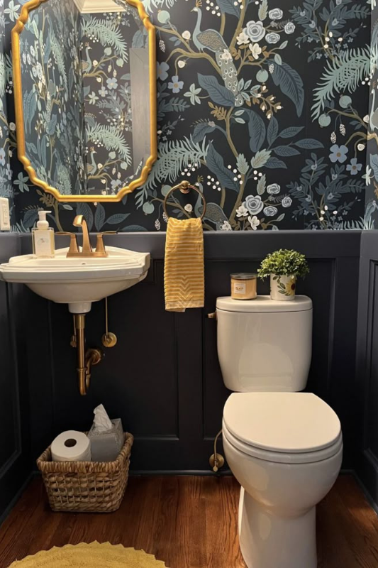 This luxury half bath idea brings drama in all the right ways. With a deep navy wall color, bold floral wallpaper, and brushed gold finishes, every element feels curated. A vintage-style mirror adds charm, while the floating sink and warm wood floor keep it grounded. This look embraces maximalist powder room ideas and proves that small doesn’t mean subtle. If you’ve been searching for statement mirror ideas for half baths or want to test powder room wallpaper inspiration, this design is the definition of small-space impact.