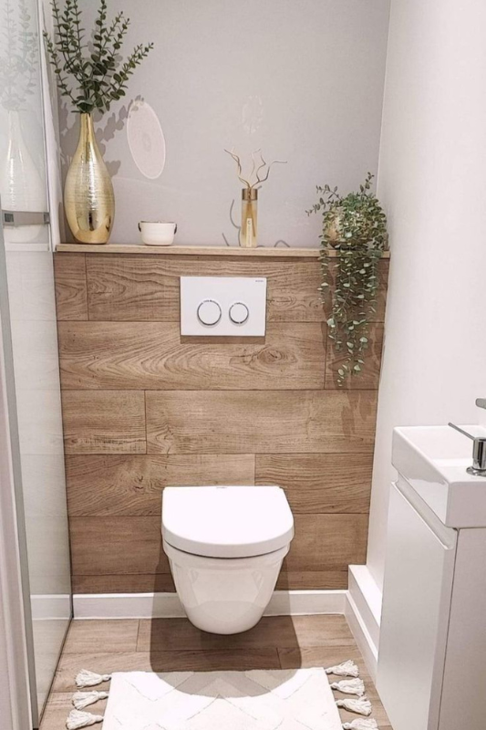 Looking for ways to add texture to a tiny bathroom? This half bath uses a warm wood accent wall behind a wall-mounted toilet to create visual depth without taking up space. Paired with a minimalist white sink and soft gray paint, this is a great example of how to use natural elements in a modern powder room. Add greenery and simple vases to complete the look. If you are searching for creative half bath designs that feel warm and modern, this setup is the perfect place to start.