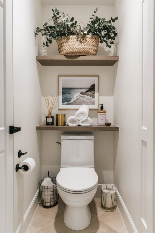7. Styled Floating Shelves in a Narrow Half Bath