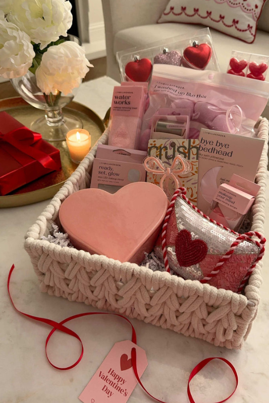 This Valentine’s Day gift basket idea leans into softness and warmth. Gentle colors, cozy textures, and self-care items come together to create a basket that feels calm and intentional.