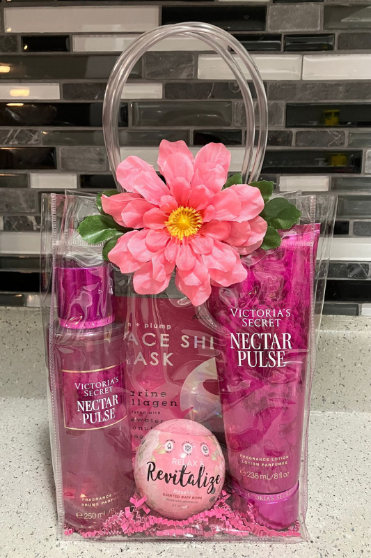 A transparent gift basket or tote instantly gives a clean, modern look that feels current and stylish. This is a great choice if you’re gifting beauty or skincare products and want everything to feel visible and intentional.