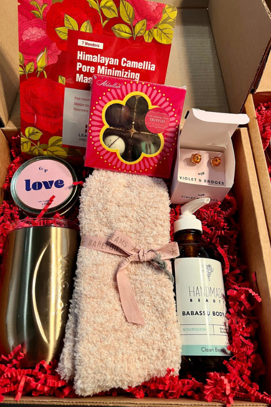 Sometimes, the simplest Valentine’s Day gift baskets are the most impactful. A small box filled with cozy socks, tea, skincare, and sweets feels thoughtful without being excessive.
