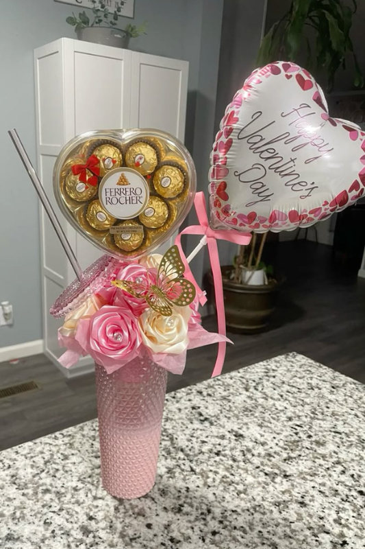 This idea leans into romance through soft colors, floral touches, and a light, elegant arrangement. It’s ideal for someone who loves beautiful details and appreciates gifts that feel decorative as well as meaningful.